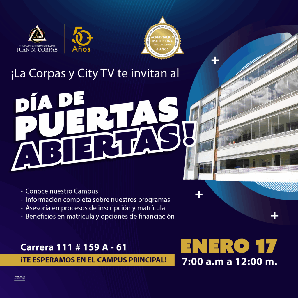 Querida Comunidad Corpista, este sábado 17 de enero la Fundación Universitaria Juan N. Corpas abre sus puertas de par en par. Queremos invitar a todos los interesados, y a los invitados de nuestra comunidad, a conocer de cerca todo lo que tenemos preparado para el futuro de nuestros estudiantes.
