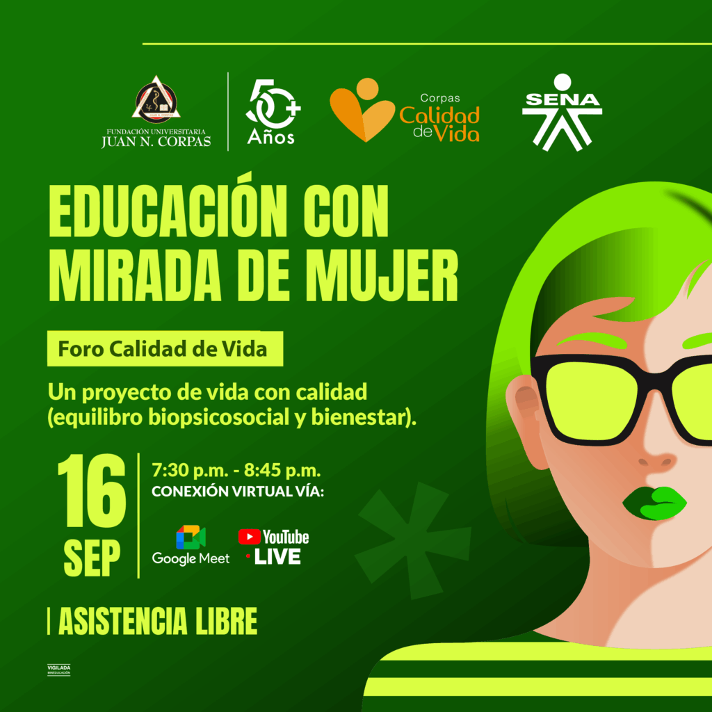 La Fundación Universitaria Juan N. Corpas, a través del programa Educación con Mirada de Mujerla Estrategia para la Permanencia Académica Materna y Paterna (PAMP) y la Escuela de Mujeres del CAE-SENA, te invita a conectarte y participar el próximo martes 16  de septiembre en nuestro Cuarto Foro de Calidad de Vida.